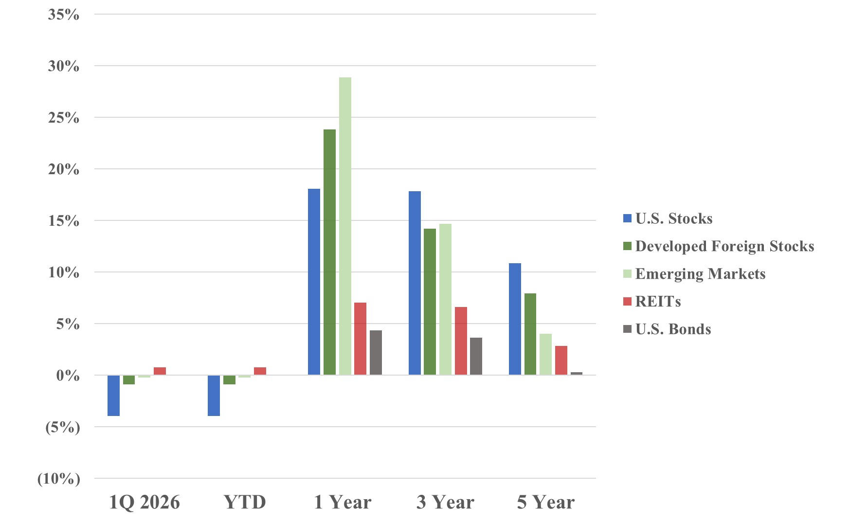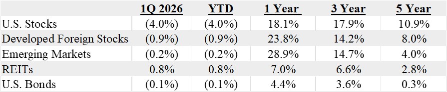 Index performance is provided as a benchmark. It is not illustrative of any particular investment. An investment cannot be made in an index. Past performance is not an indication of future results. Russell 3000 Index, MSCI World ex USA Index, MSCI EM Index, S&P Global REIT Index, US Aggregate Bond Index. Returns as of 3/31/2026.